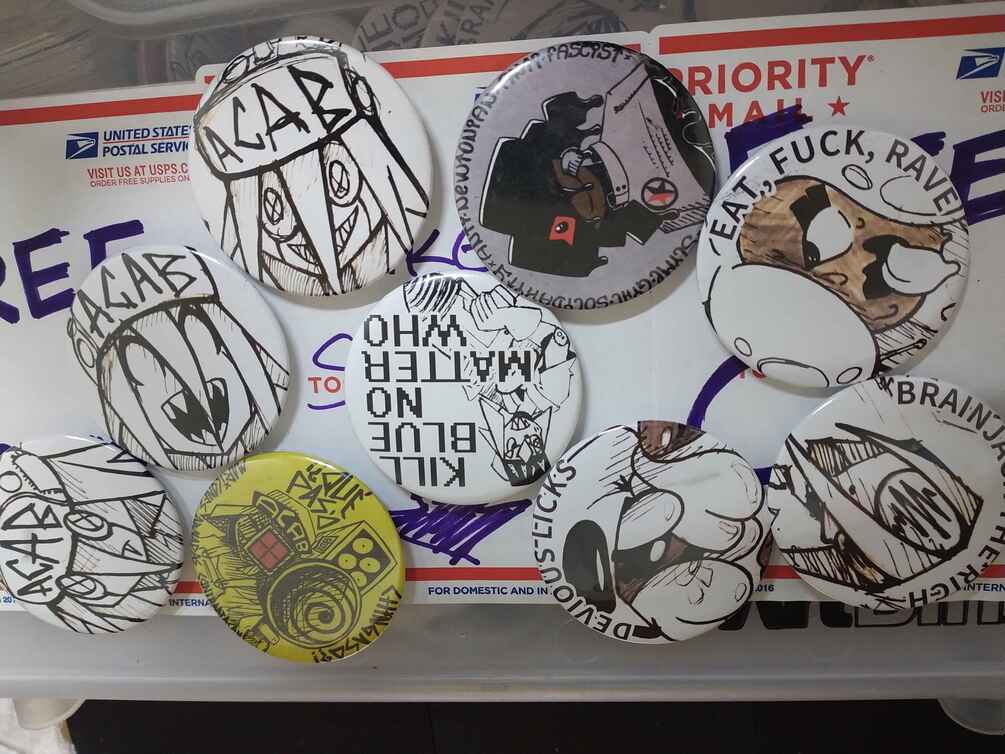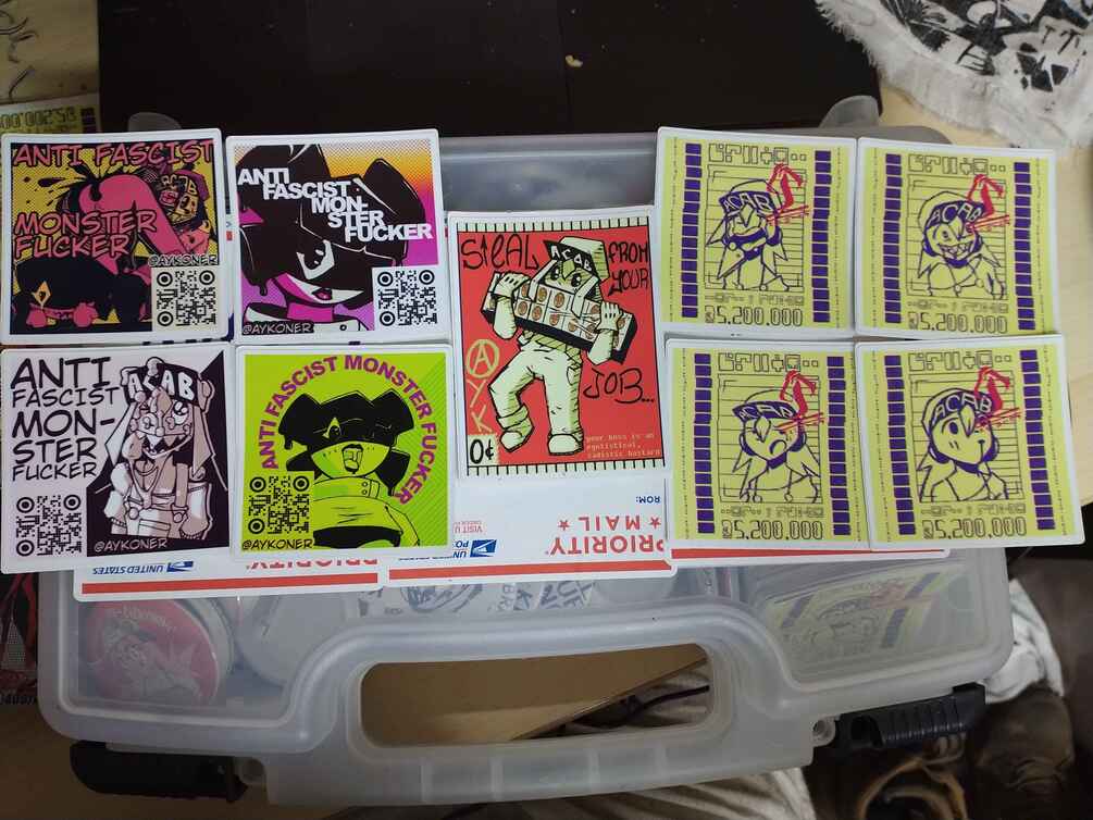9-16 stickers, 9 pins, 1 zine, while supplies last